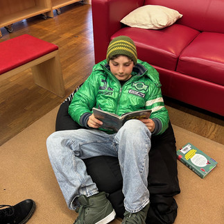 Michaela arbeitet in der Bücherei und manchmal bestellt sie sogar neue Bücher für uns. Sie zeigt uns auch neue Bücher und hat gute Empfehlungen für uns. Wenn wir Bücher ausgewählt haben, dürfen wir noch ein bisschen lesen. In der Bücherei gibt es zum Lesen Sessel und Sitzsäcke. Die Lesezeit ist ruhig und die Sachen zum Sitzen sind sehr fein und bequem. Sie haben super viele Bücher zur Auswahl. Es gibt ganz einfache oder dicke Bücher, Bilderbücher, Sachbücher oder sogar englische Bücher.